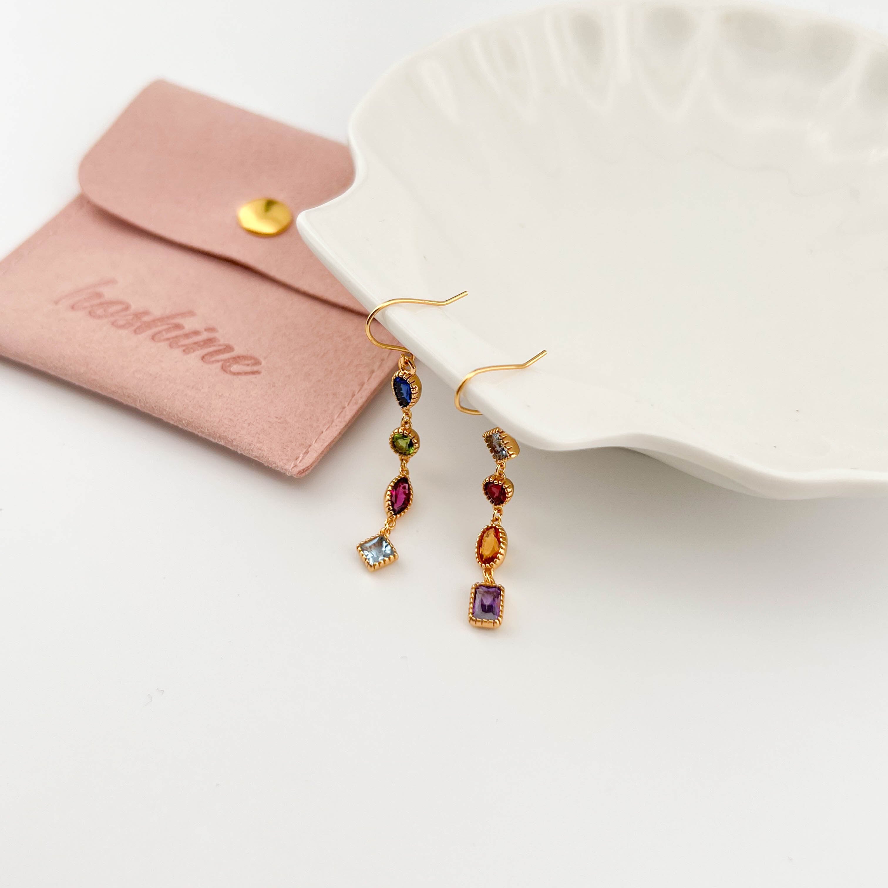 カラフルストーンが揺れるたびにきらめき、顔まわりを華やかに彩るロングピアス。