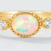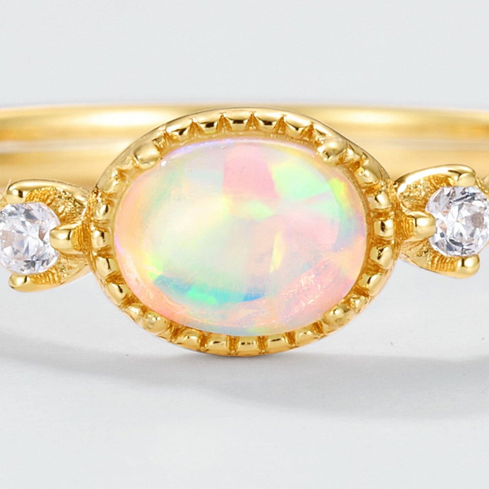 虹色にきらめく合成オパールが指先を華やかに演出。
