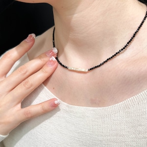 シンプルでありながら奥深い魅力を持つ、このショートネックレスは、天然ブラッククリスタルと淡水バロックパールが織り成す美しさが特長です。ブラッククリスタルの神秘的な光沢と、バロックパールの個性的な形状は、互いに引き立て合い、上品さと大胆さを兼ね備えた一品となっています。このデザインは、モダンさとクラシックな要素を融合させ、日常のスタイルに華やかさを加えるアイテムです。
