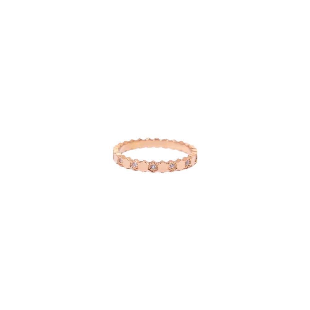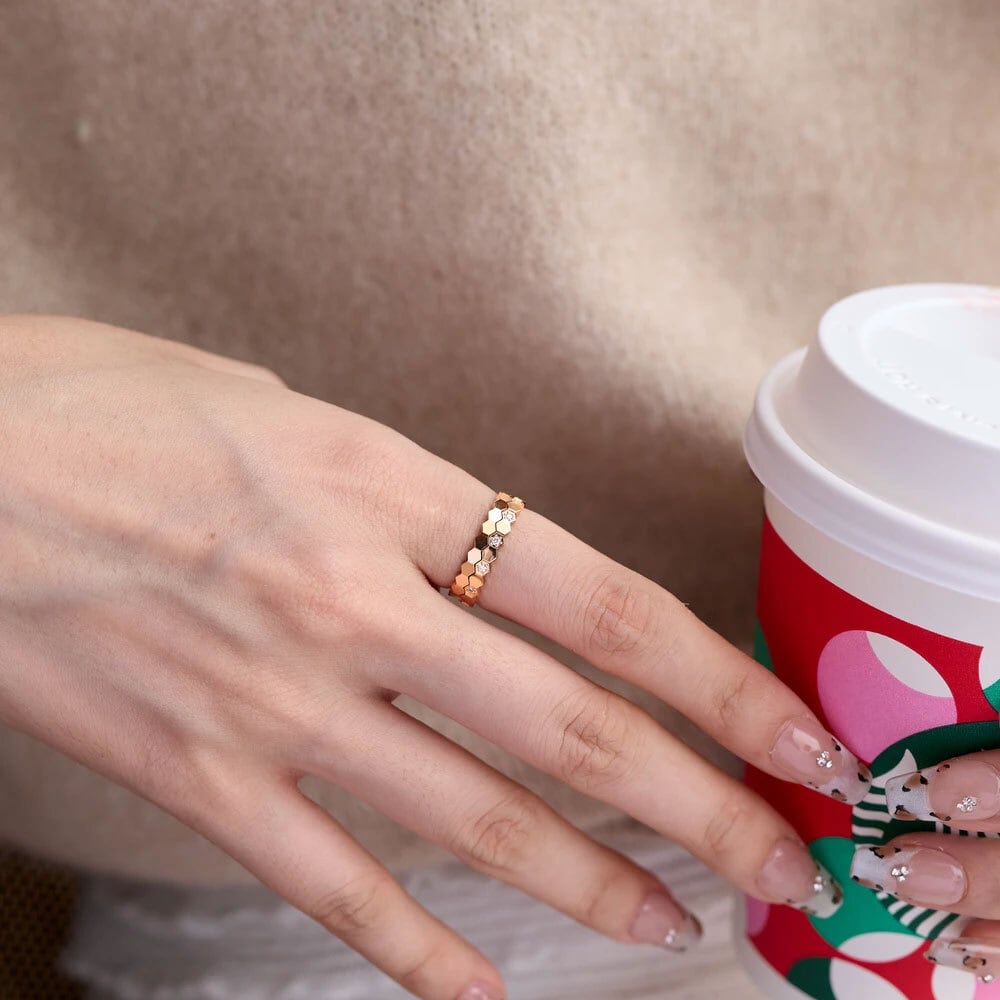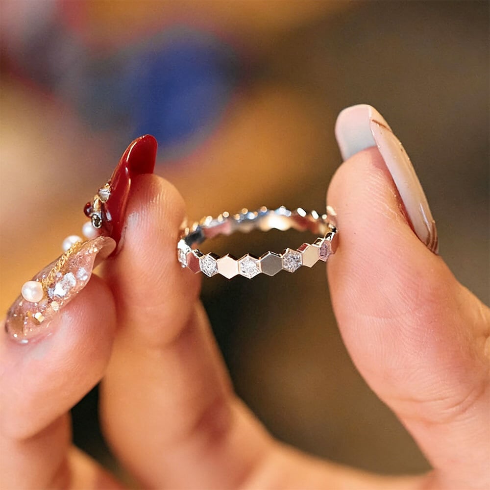 洗練されたハニカムデザインを採用したこのリングは、特別な輝きを放つモアサナイトが特徴です。ハニカムの美しい構造が、光を受けて反射することで、リング全体に神秘的な輝きを与えます。どの角度から見ても自身の魅力を引き立て、身に着けた方の指を華やかに飾ります。このリングは、洗練されたデザインと優雅さを兼ね備え、特別な日のギフトにも非常にお勧めです。